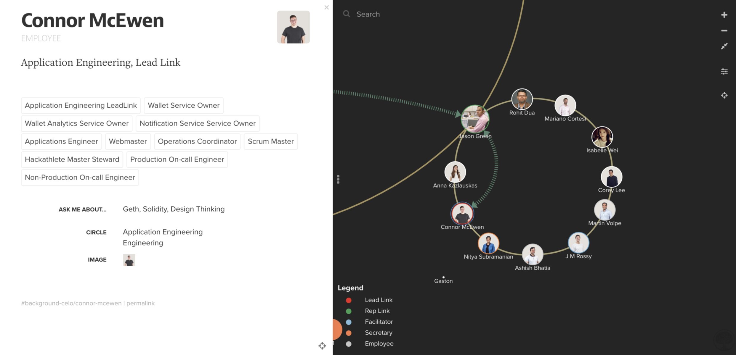 At Celo, members reside in different circles by profession, yet are oftentimes playing multiple roles and cross paths with each other; the interactive organization chart can be easily updated to helps everybody quickly identify their teammates and basic information as the company grows.