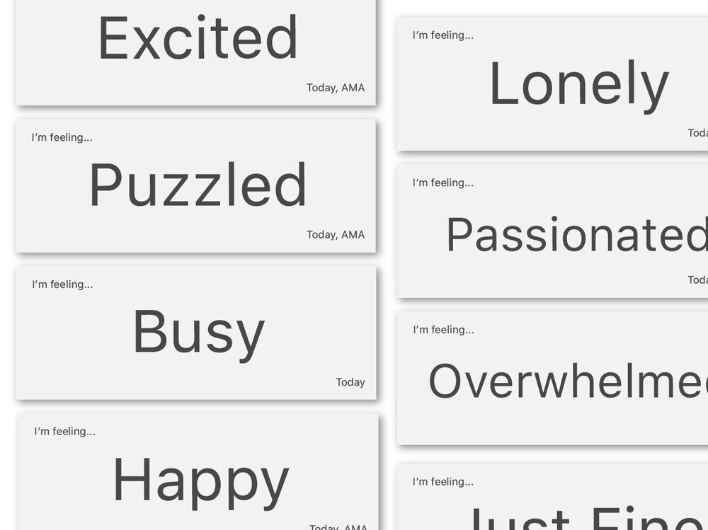 A calendar-style flip book with different emotions and moods listed on each page, placed on everyone’s desk as a status indicator to open up (sometimes turn away) conversations.