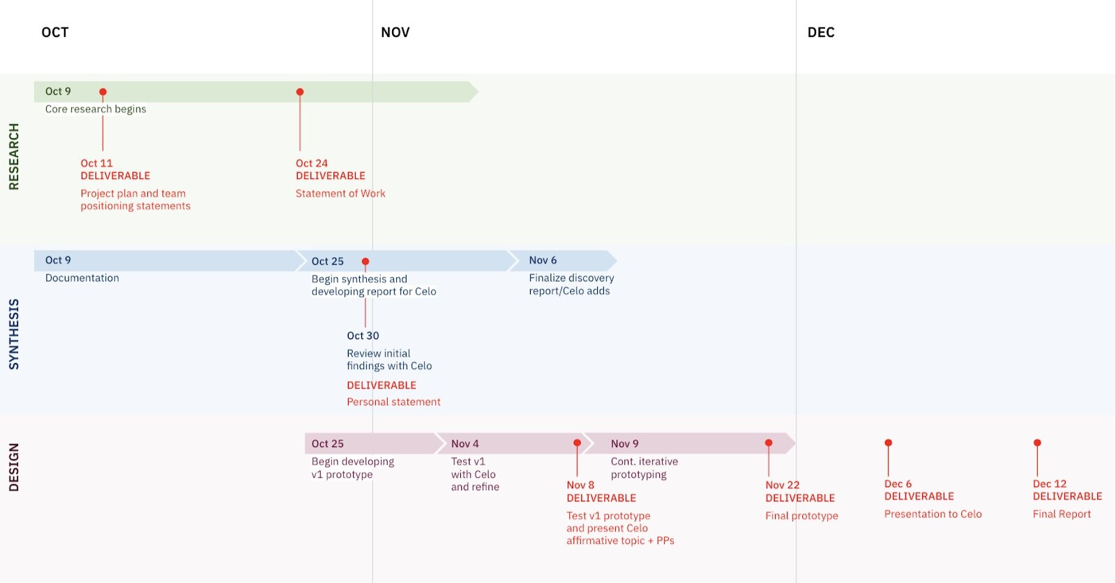Before diving deep into the research, we created a timeline that both us and our partner at Celo can agree upon to keep track of the progress (and sanity).
