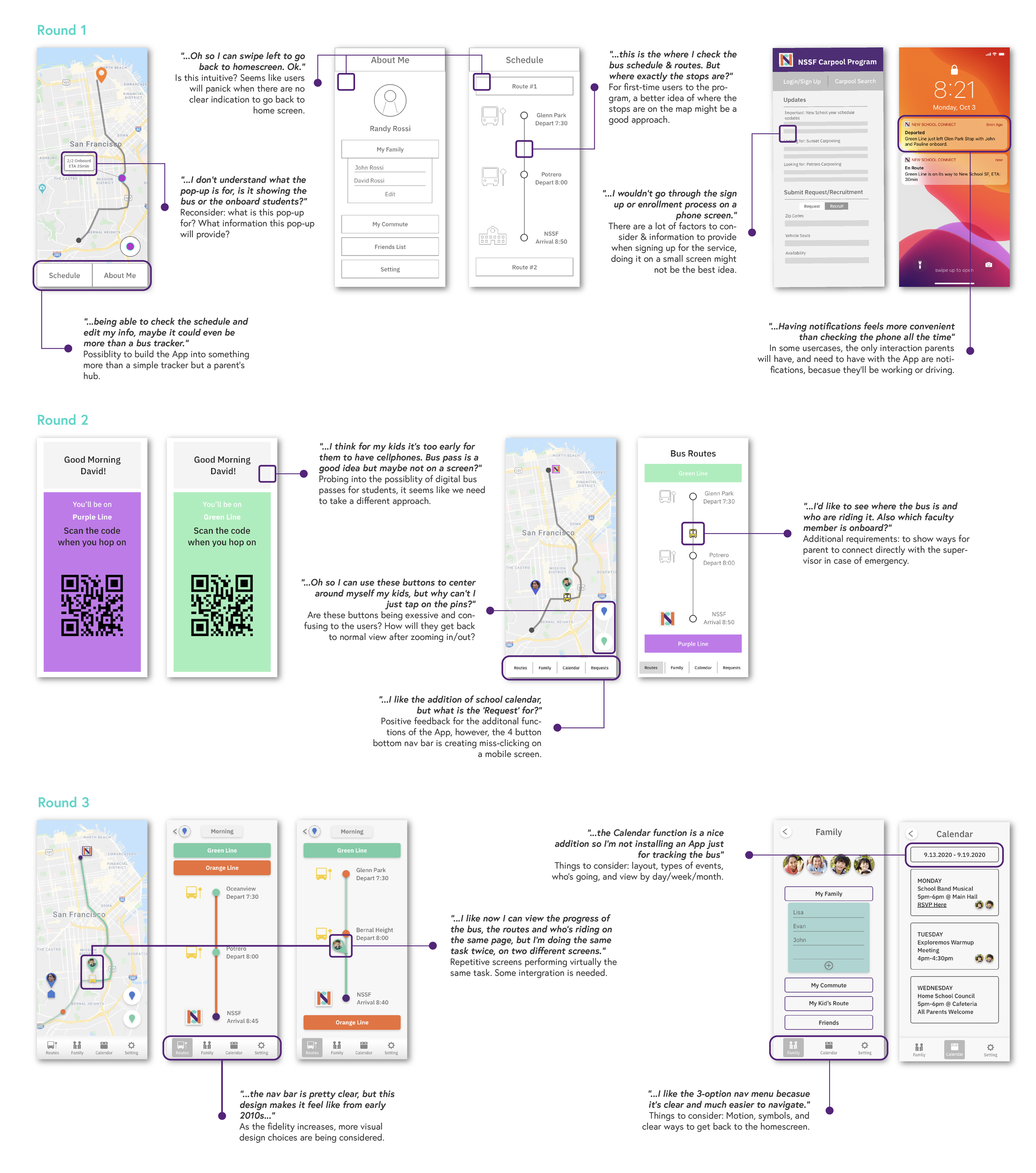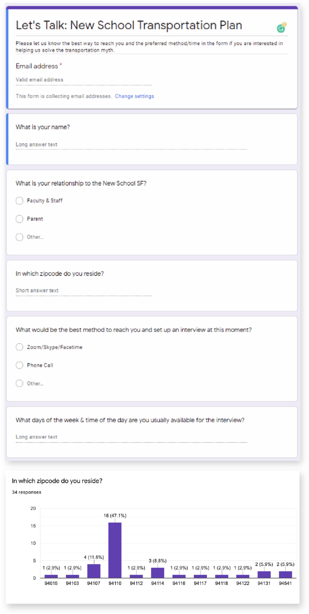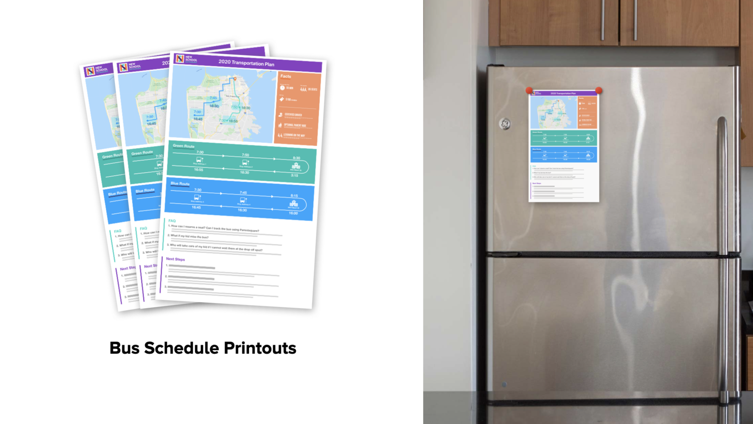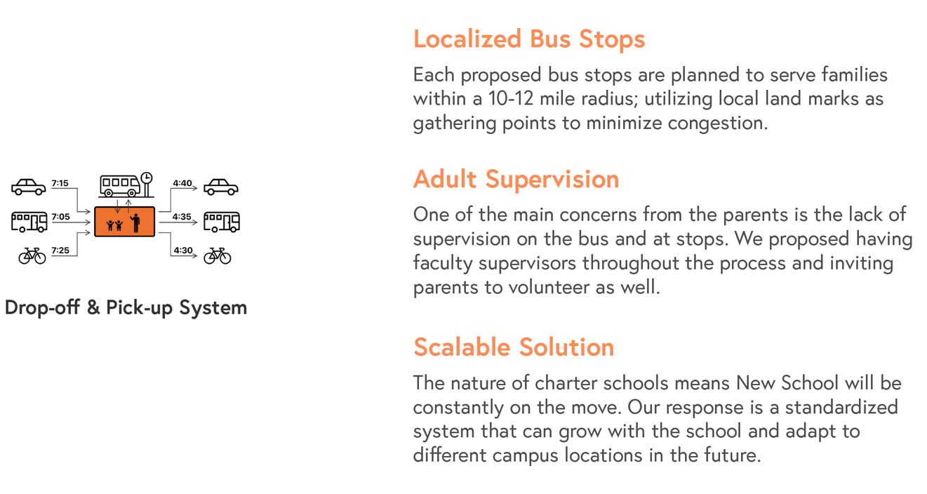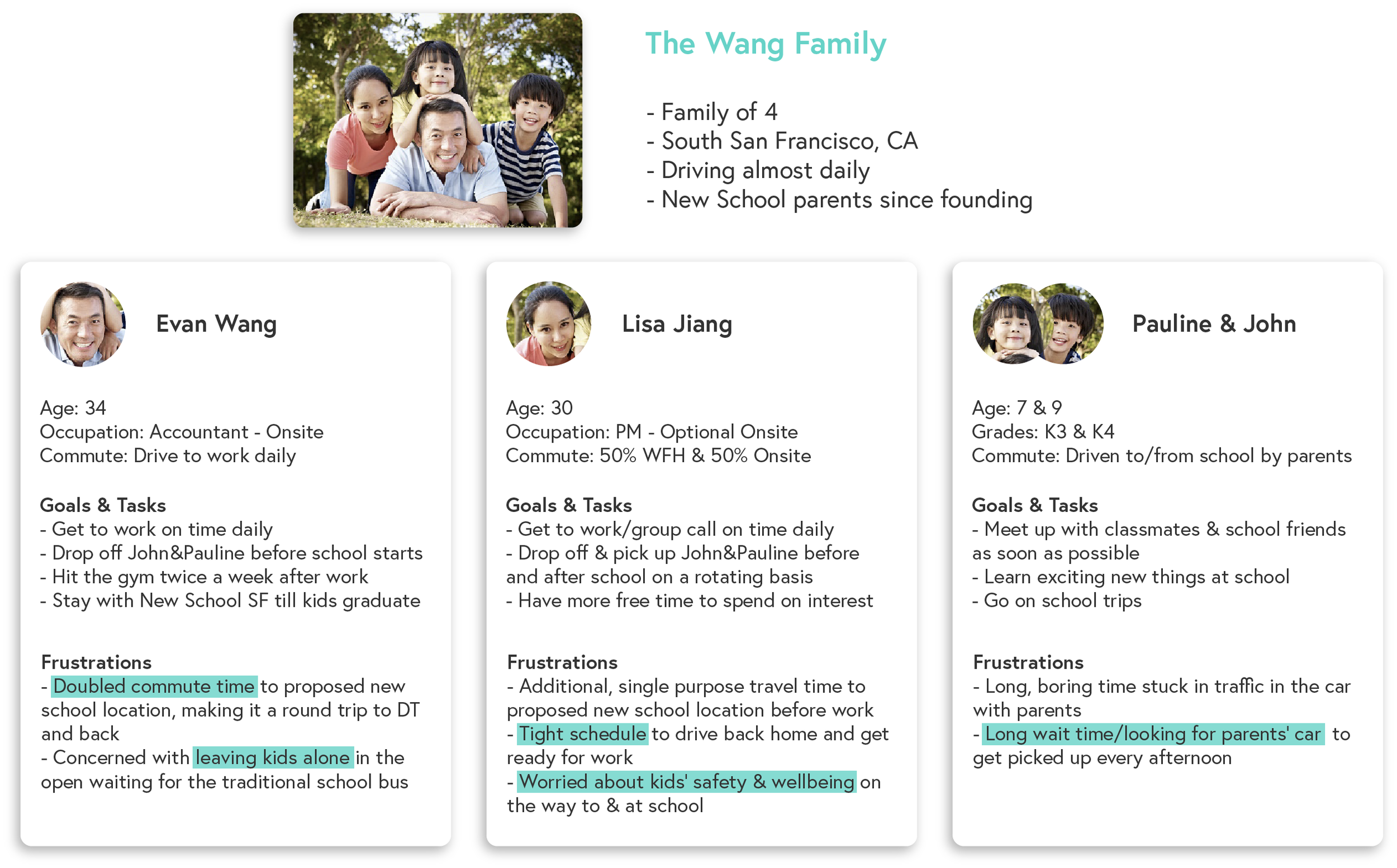 We interviewed both New School staff members that are coordinating the bus plan, and parents who are interested in sharing their thoughts with us. The goals are to gain a better understanding of New School’s equity-driven experiences from all perspectives, and hearing opinions and experiences that would ultimately decide the form of our solution.