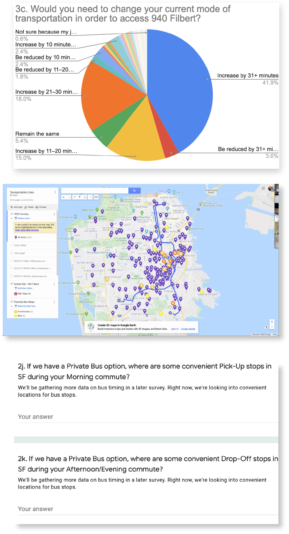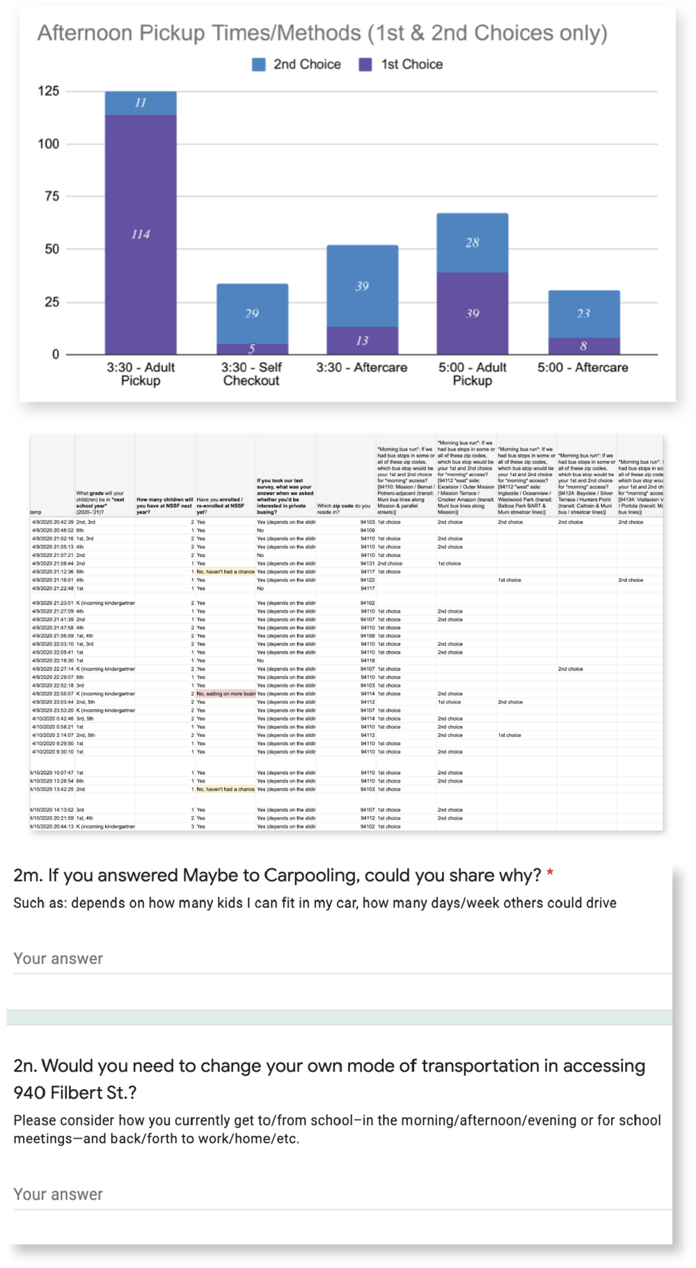 We had the great opportunity of working with a partner who understands the importance of data gathering and thus has access to a wealth of quantifiable information. Meanwhile, a dedicated survey was sent out to gauge interest and gather thoughts on the transportation plan from the parent community.