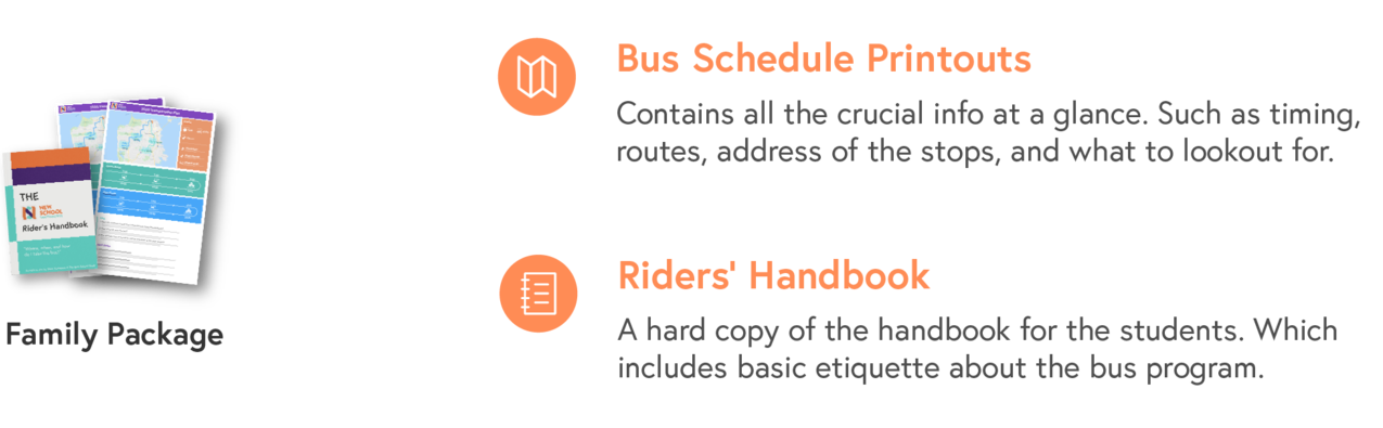 The last piece of the puzzle in our solution framework came in the form of a family package that contains all necessary materials about the program. The Rider’s Handbook includes DOs and DON’Ts onboard the bus, and instructions to different stops.