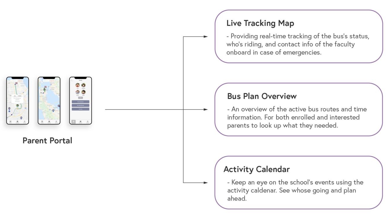 Knowing that we are looking for a systematic solution. We pivoted from focusing solely on the planning and logistics of the school bus and created a 3-part solution to cover each new school families’ journey from their home to school and back; within it, I'm responsible for designing the Family mobile App.