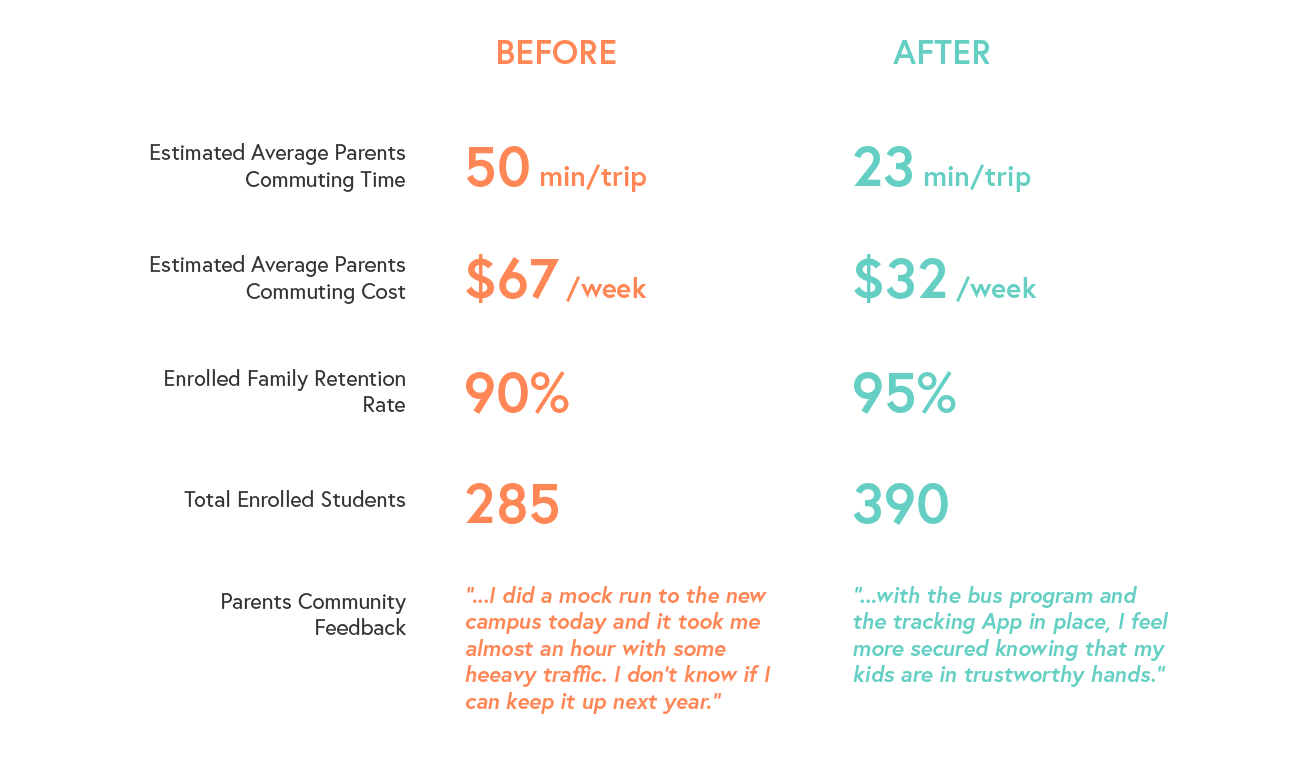 Working closely with the school leadership and a parent committee, we plotted two bus routes to cover as many families as possible throughout the city to reduce their commute time to the new campus.