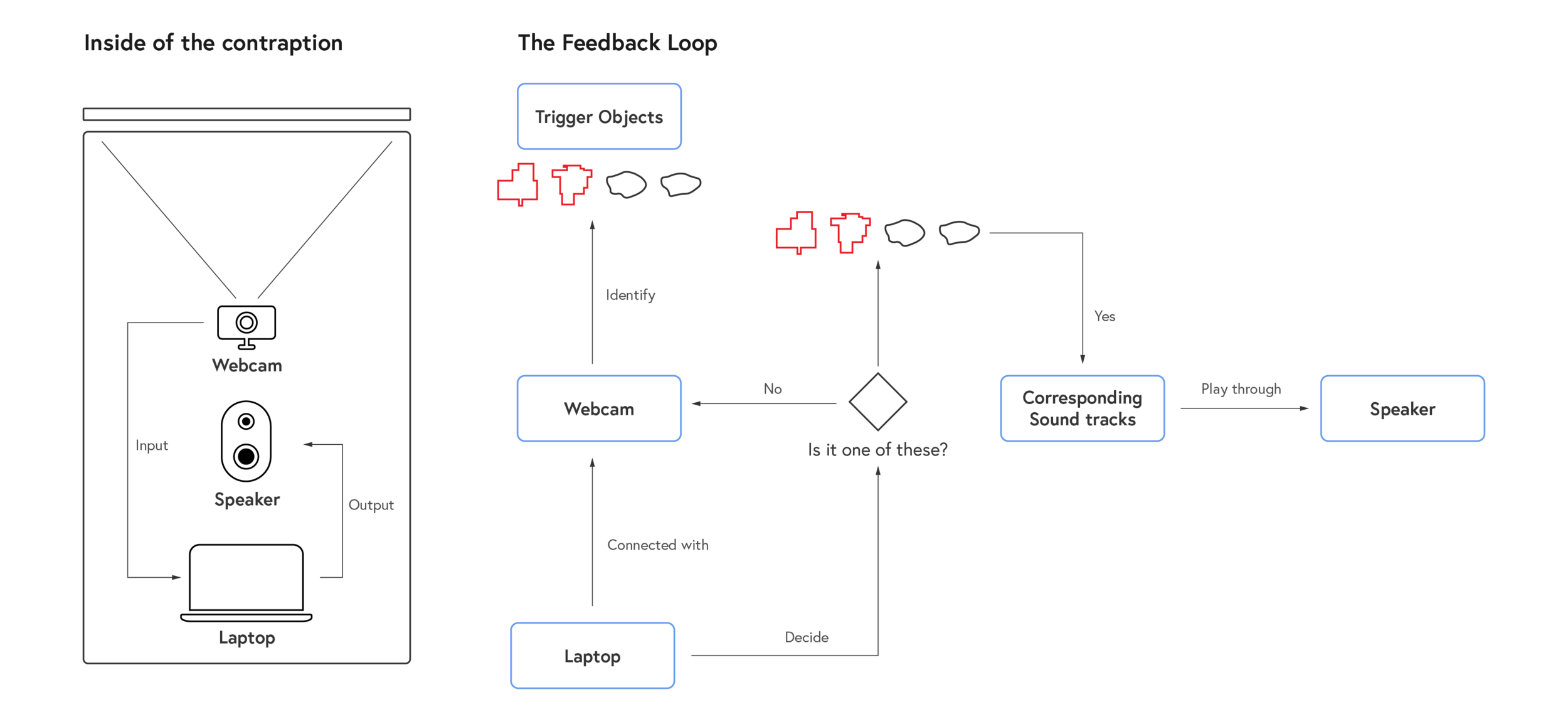 The fundamental system behind our rig is quite simple and classic: a feedback loop consists of a sensor(a webcam), a processor(the image recognition program), and an actuator(the speaker).